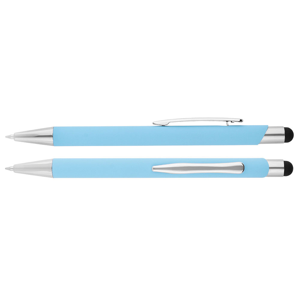 Hliníkové guľôčkové pero Bernardo s chrómovanými časťami a stylusom na ovládanie dotykových zariadení - modrá svetlá