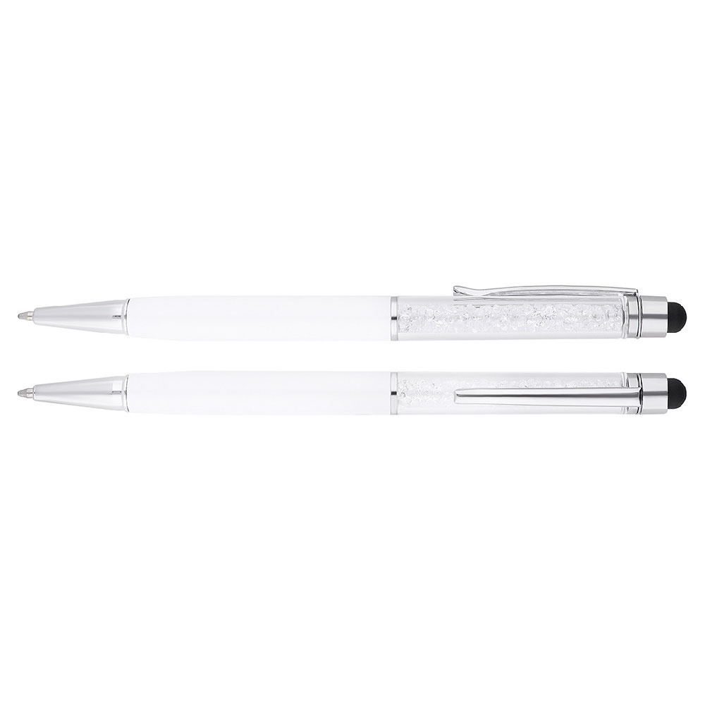 Hliníkové guličkové pero s kryštálmi a gumou na ovládanie dotykových displejov v plastovom boxe.