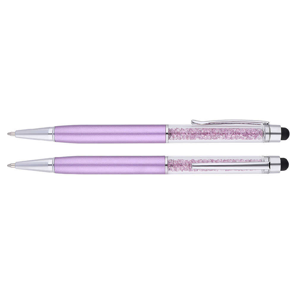 Hliníkové guličkové pero s kryštálmi a gumou na ovládanie dotykových displejov v plastovom boxe.