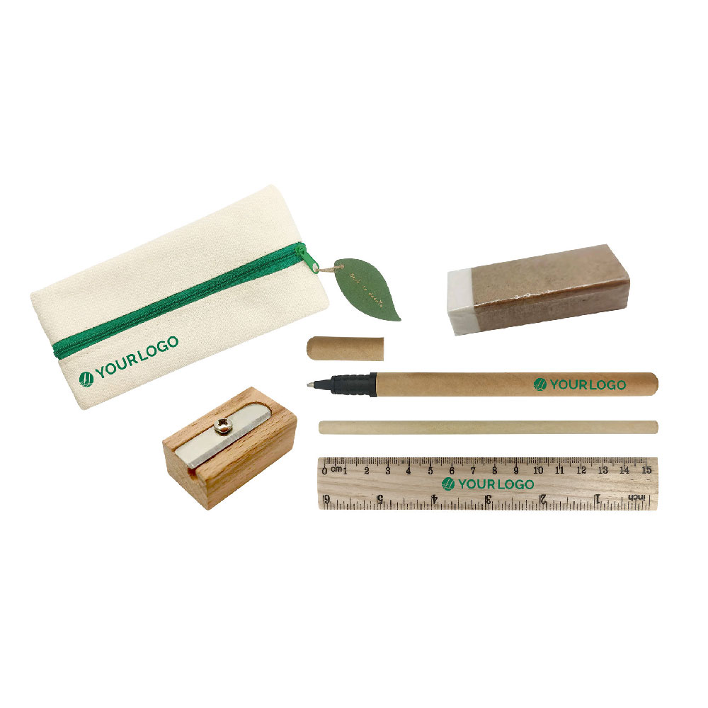 Vrátane guľôčkového pera (s modrou náplňou), ceruzky (HB, neorezané), 15 cm pravítka, strúhadlá a gumy.