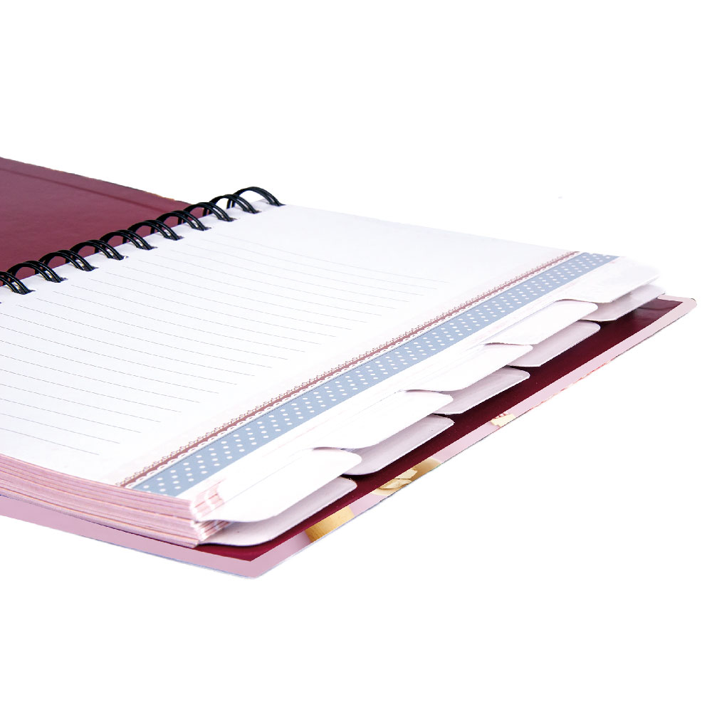 Väzba: krúžková väzba, pevné dosky, mašľou priprevnená vareška