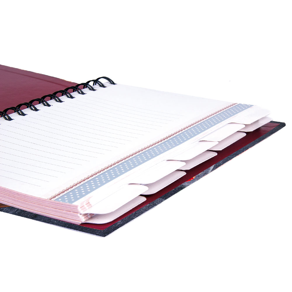 Väzba: krúžková väzba, pevné dosky, mašľou priprevnená vareška