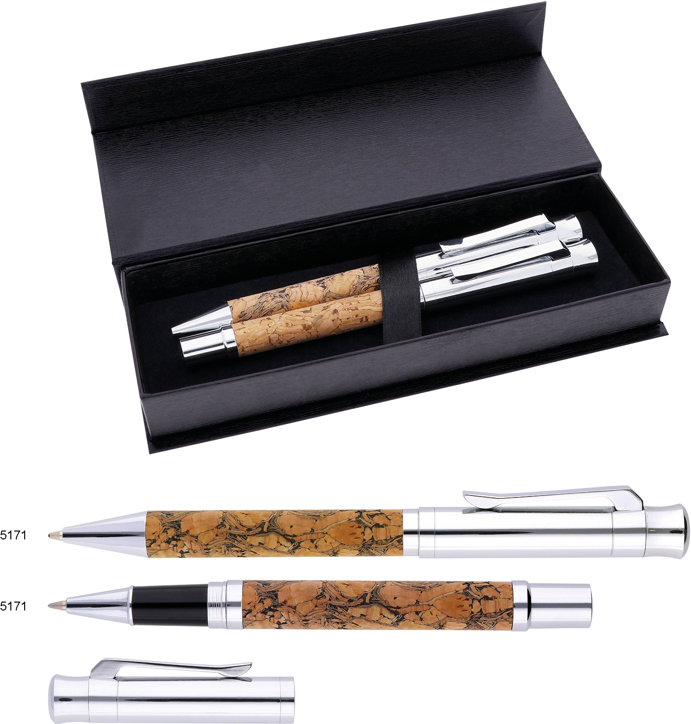 Luxusní kovová sada kuličkového pera a rolleru s korkovými doplňky v krabičce - hnědá světlá/stříbrná lesklá
