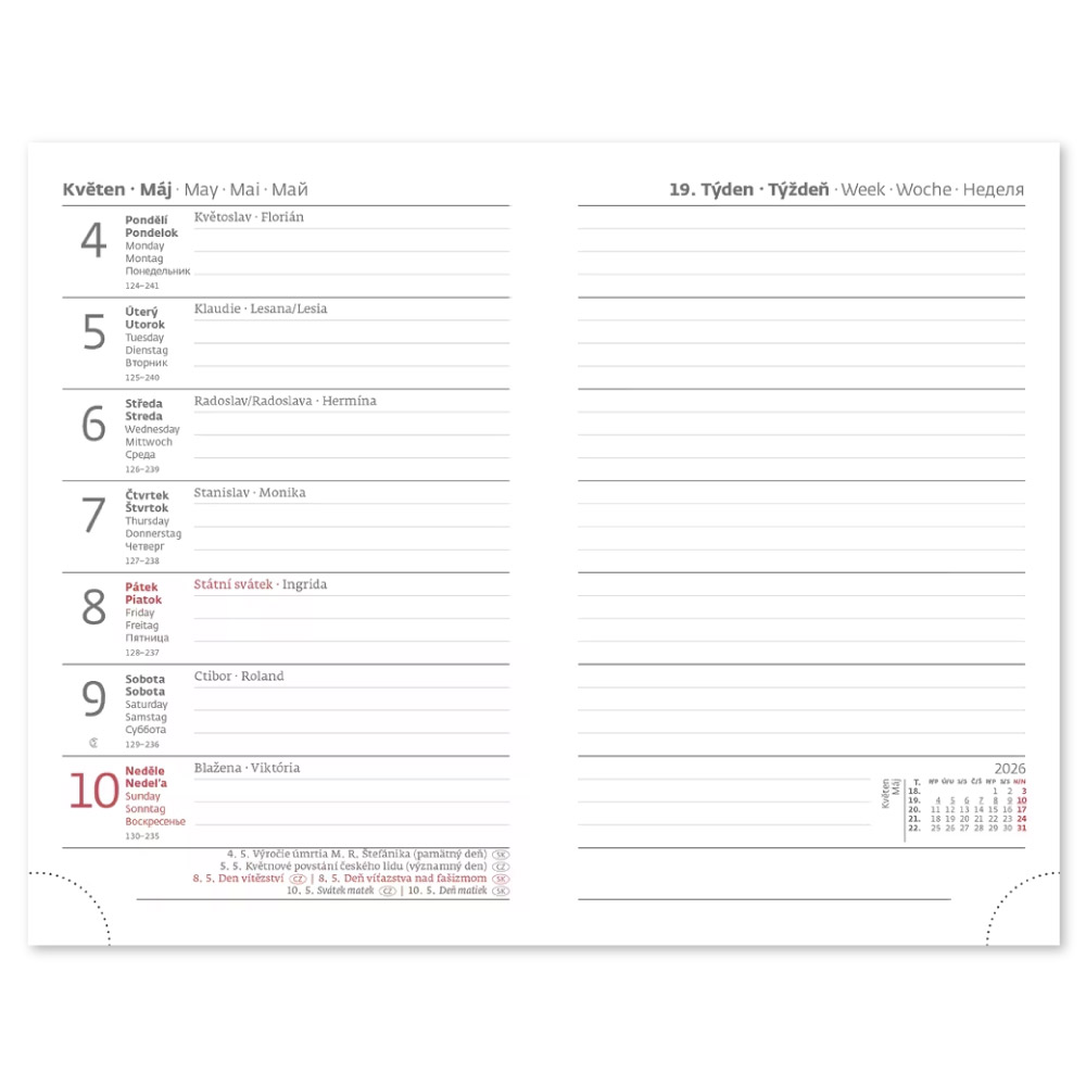 medzinárodné sviatky, ročný výhľad, týždenný layout, adresár.