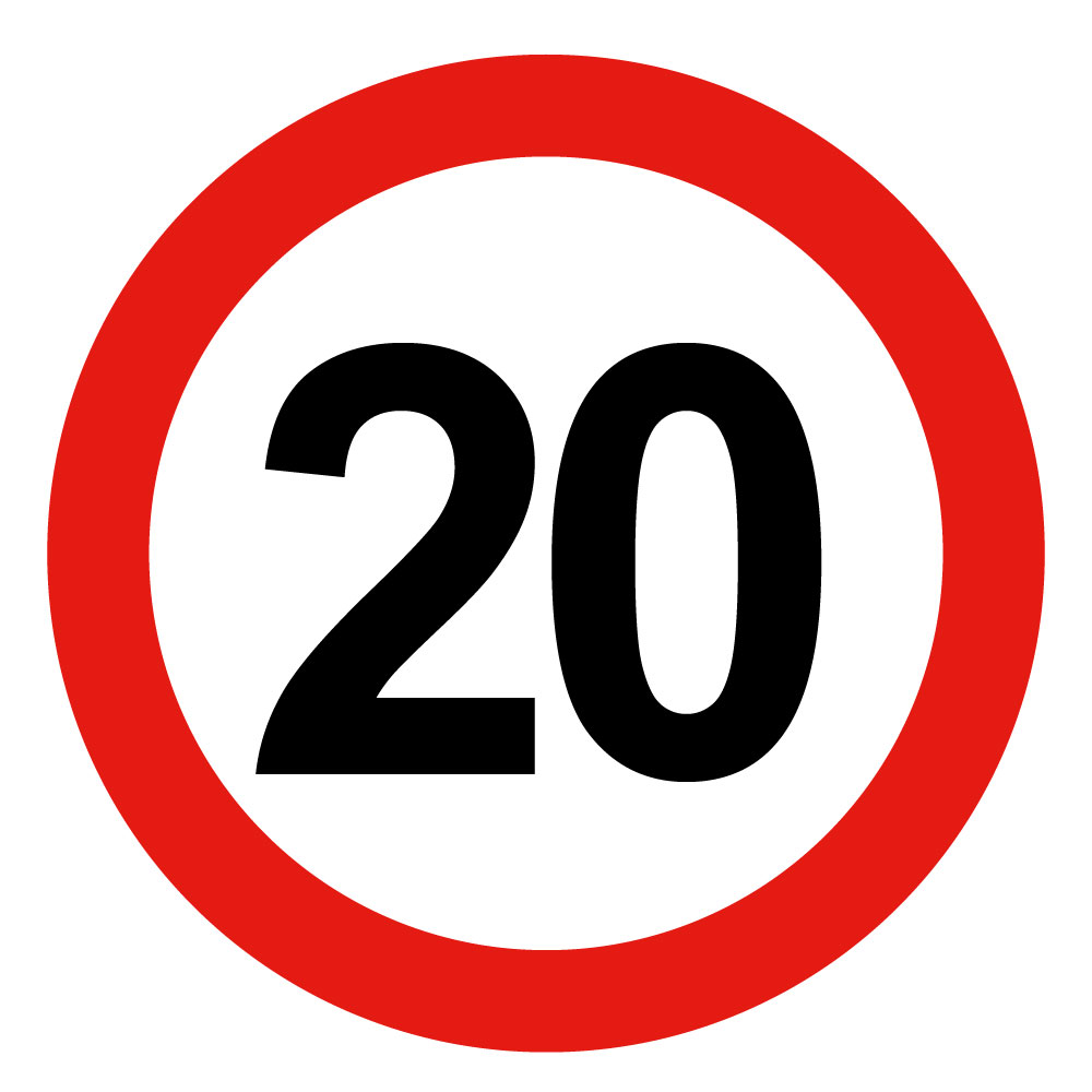 Najvyššia obmedzená/konštrukčná rýchlosť vozidla 20 km, bezpečnostná tabuľka, plast 2 mm - kruh 20 cm