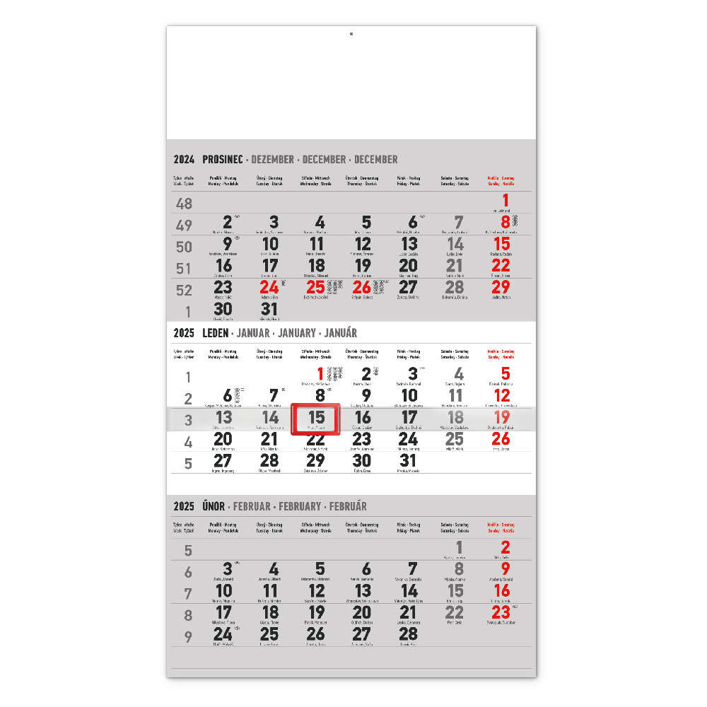 Nástenný kalendár 2025 3-mesačný štandard šedá – s českými menami CZ