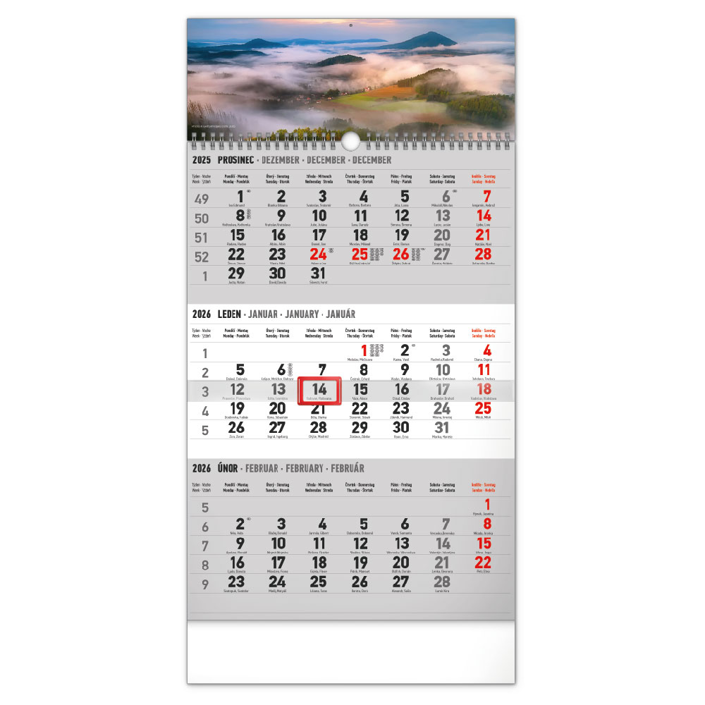 Nástenný kalendár 2026 3-mesačná Krajina šedá - s českými menami