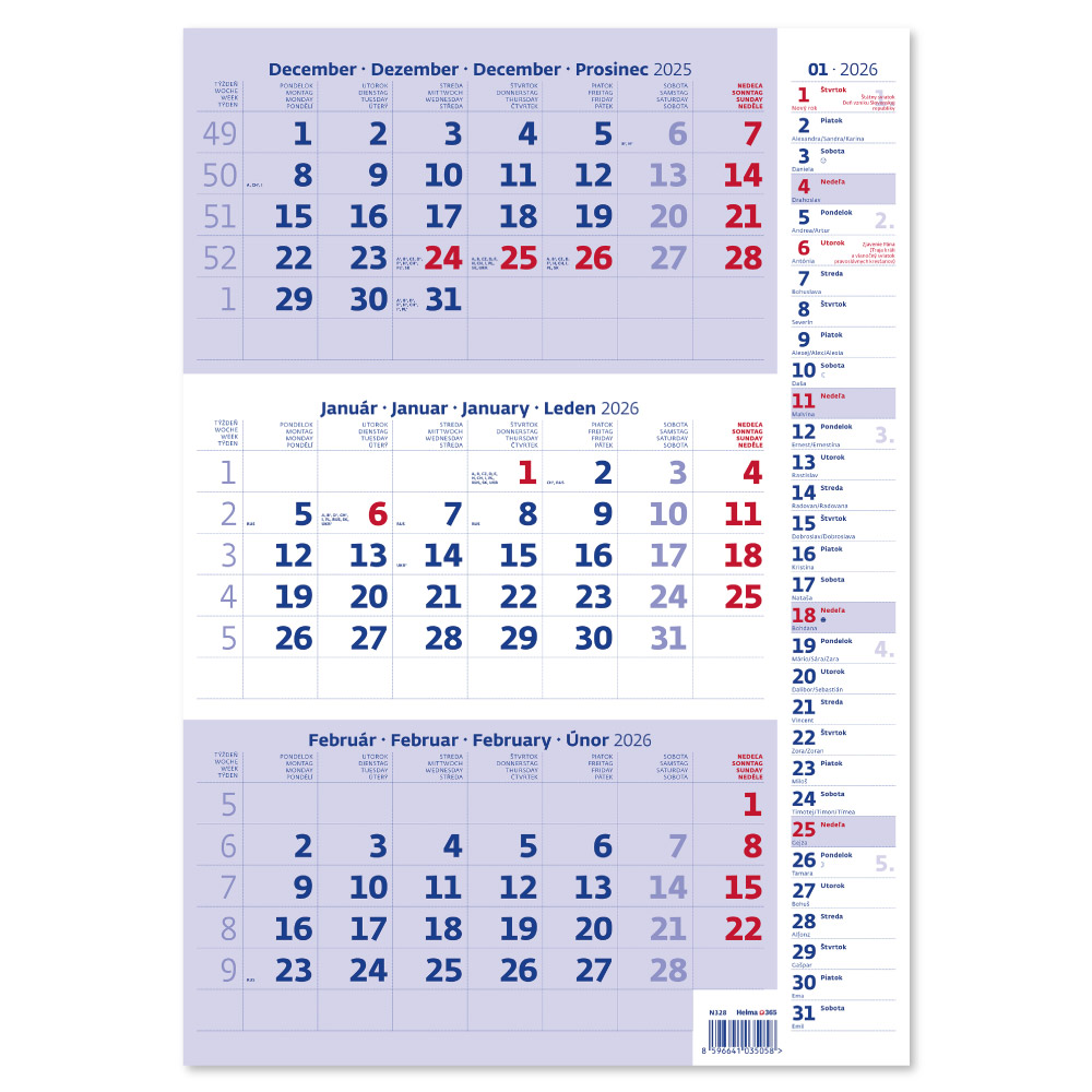 Nástenný kalendár 2026 - Trojmesačný kalendár modrý s poznámkami