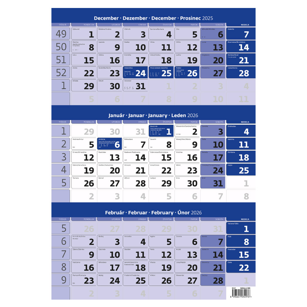 Nástenný kalendár 2026 - Trojmesačný kalendár modrý