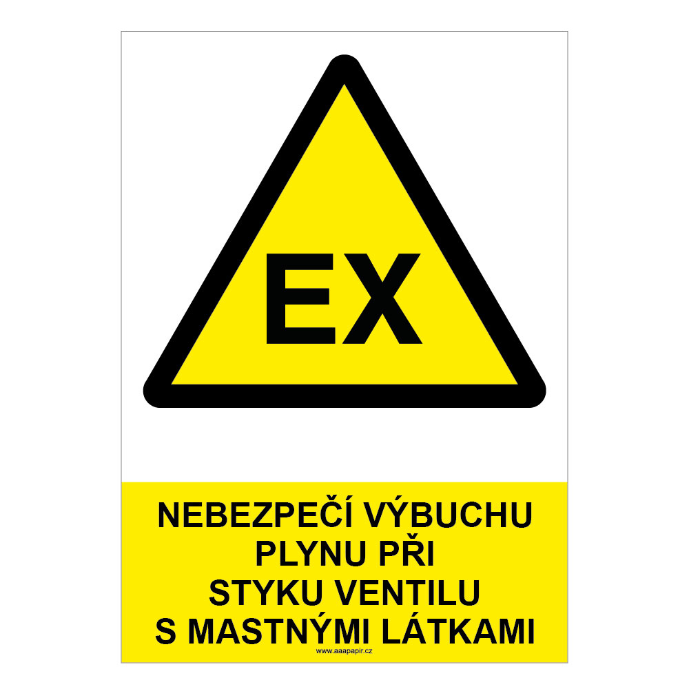 NEBEZPEČÍ VÝBUCHU PLYNU PŘI STYKU VENTILU S MASTNÝMI LÁTKAMI - bezpečnostní tabulka, samolepka A4
