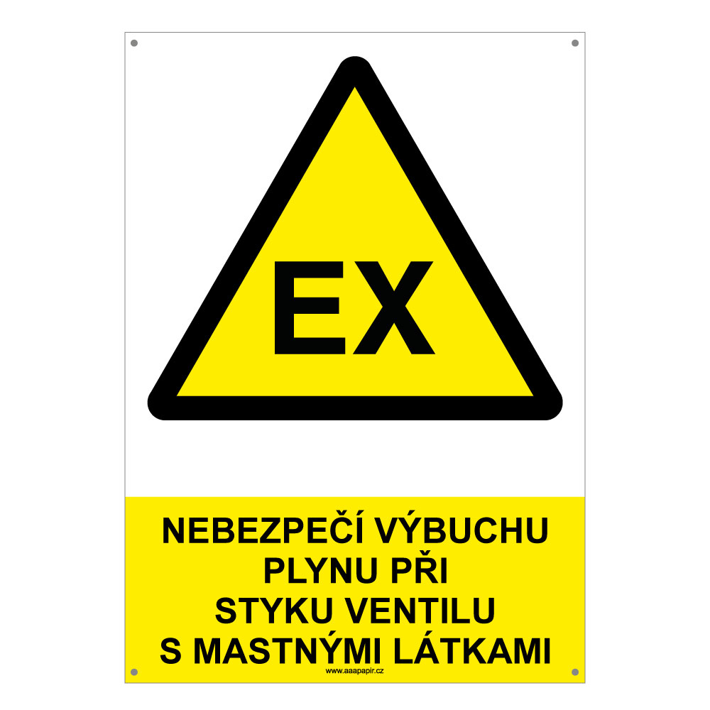 NEBEZPEČÍ VÝBUCHU PLYNU PŘI STYKU VENTILU S MASTNÝMI LÁTKAMI - bezpečnostní tabulka s dírkami, plast A4, 2 mm