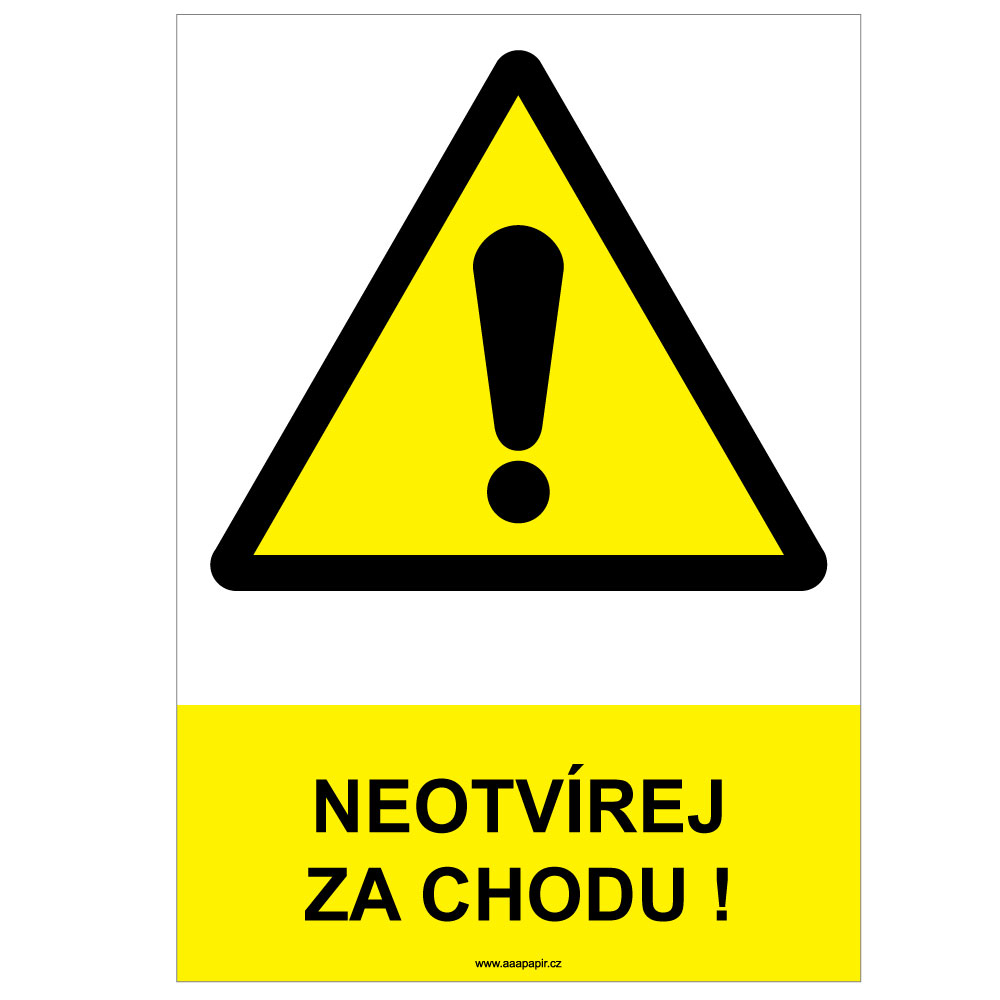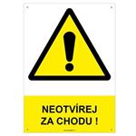 NEOTVÍREJ ZA CHODU ! - bezpečnostní tabulka, samolepka A4