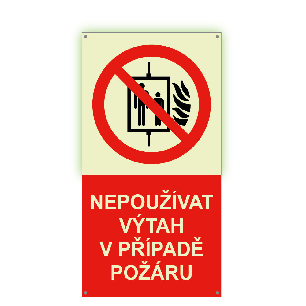 Nepoužívat výtah v případě požáru - fotoluminiscenční tabulka, plast 2 mm 80x150 mm