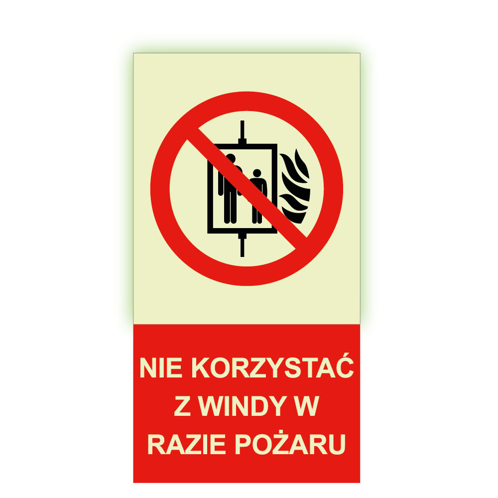 Nie korzystać z windy w razie pożaru - fotoluminescencyjny znak, płyta PVC 2 mm 80x150 mm