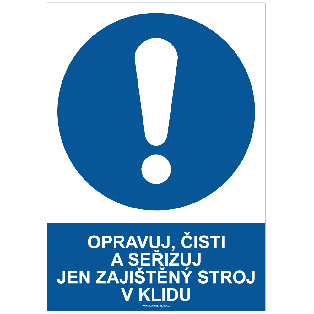 OPRAVUJ, ČISTI A SEŘIZUJ JEN ZAJIŠTĚNÝ STROJ V KLIDU - bezpečnostní tabulka, samolepka A4