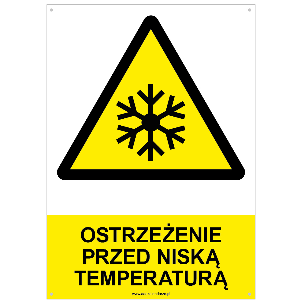 OSTRZEŻENIE PRZED NISKĄ TEMPERATURĄ - znak BHP z dziurkami, płyta PVC A4, 2 mm