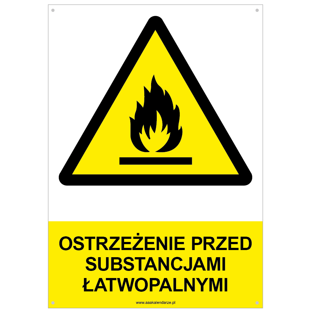 OSTRZEŻENIE PRZED SUBSTANCJAMI ŁATWOPALNYMI - znak BHP z dziurkami, płyta PVC A4, 2 mm