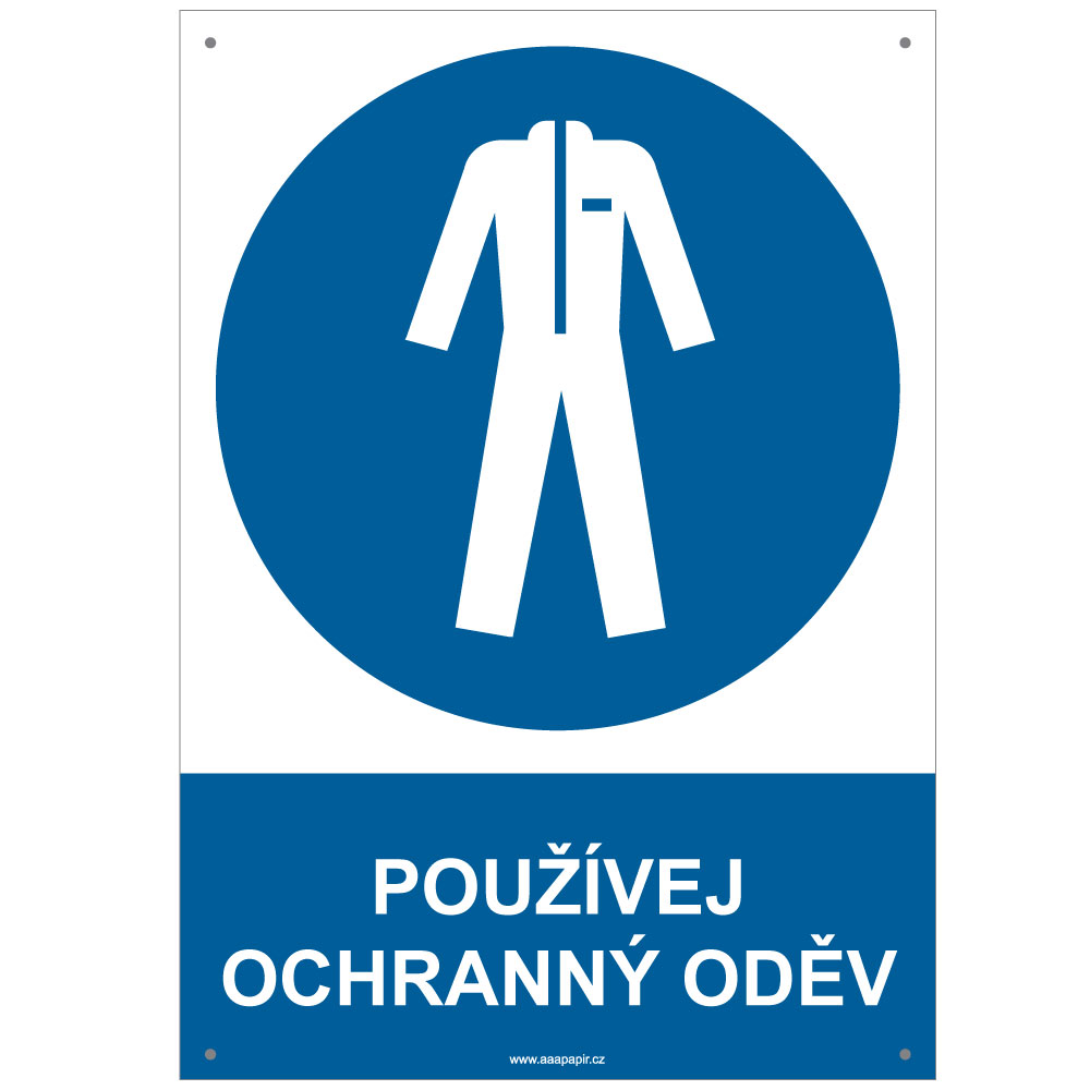 POUŽÍVEJ OCHRANNÝ ODĚV - bezpečnostní tabulka s dírkami, plast A4, 2 mm