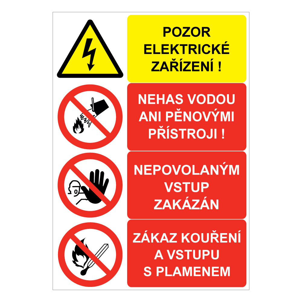 Pozor elektrické zařízení - nehas vodou ani pěnovými přístroji - nepovolaným vstup zakázán - zákaz kouření a vstupu…