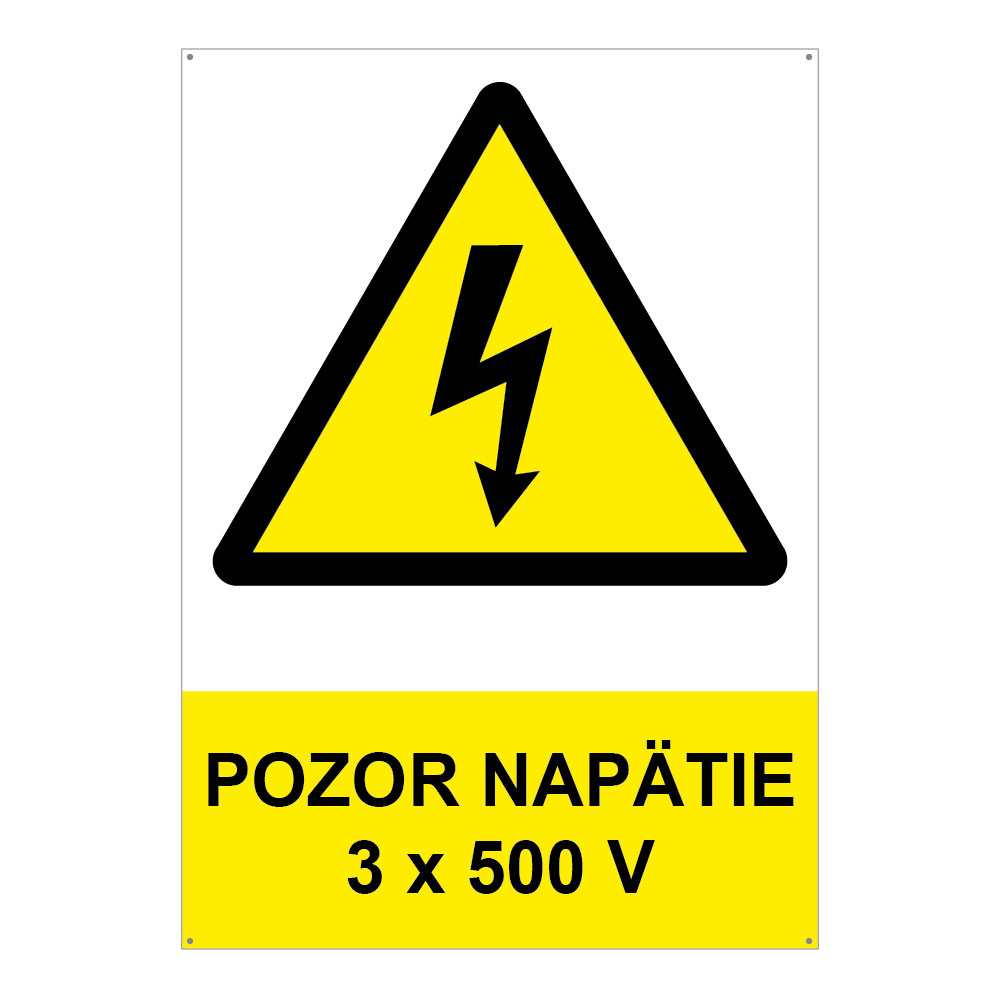 Pozor - napätie 3 x 500 V - bezpečnostná tabuľka s dierkami, plast 2 mm, A4