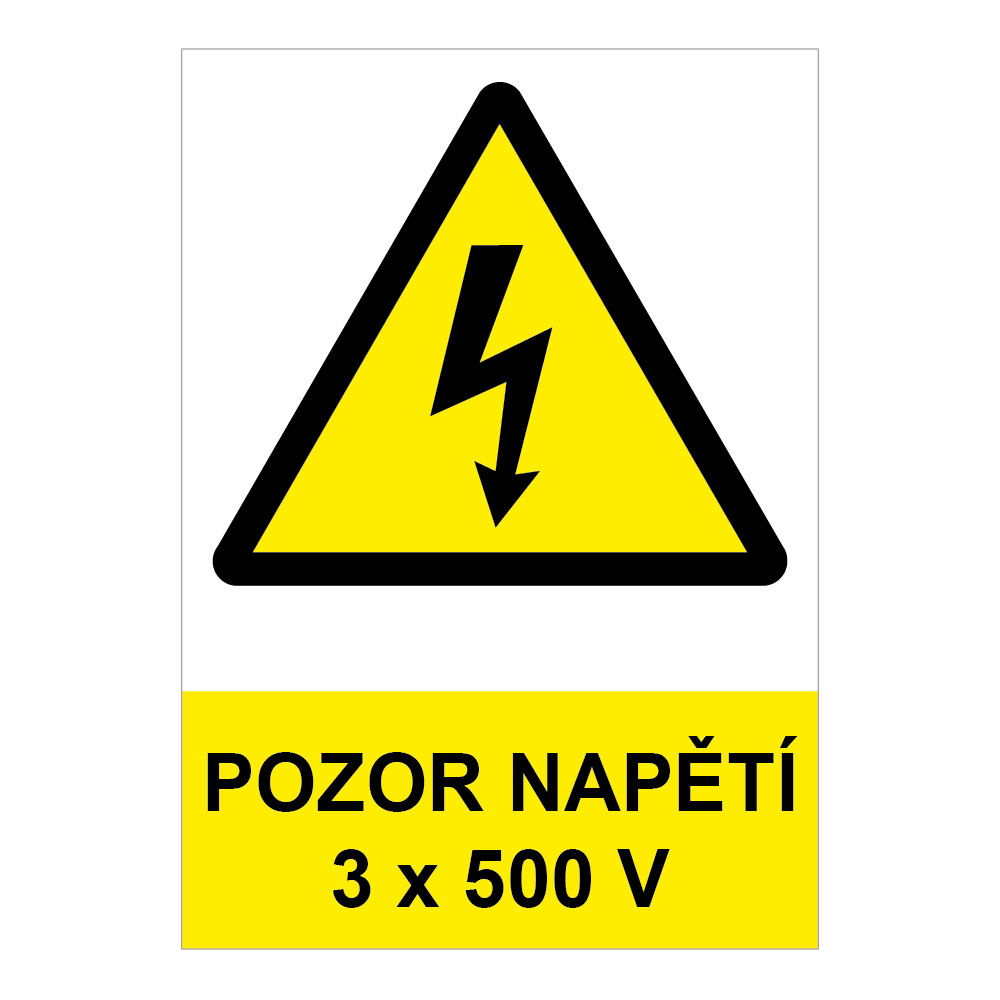 POZOR - napětí 3 x 500 V ! - bezpečnostní tabulka, plast 0,5 mm, A4