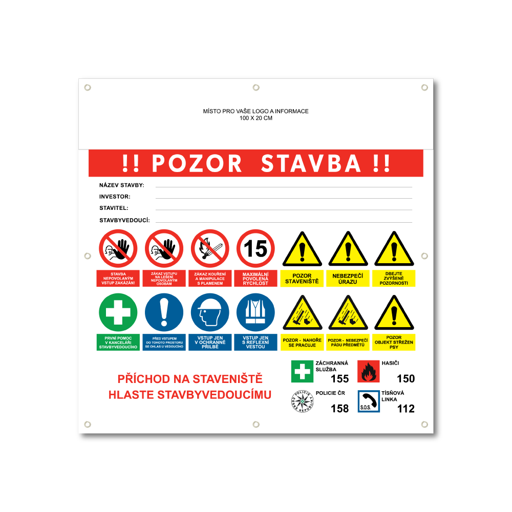 Bezpečnostní banner doplníme Vašim logem a dle přání Vám doplníme i jmenné údaje (stavbyvedoucí, investor atd.).