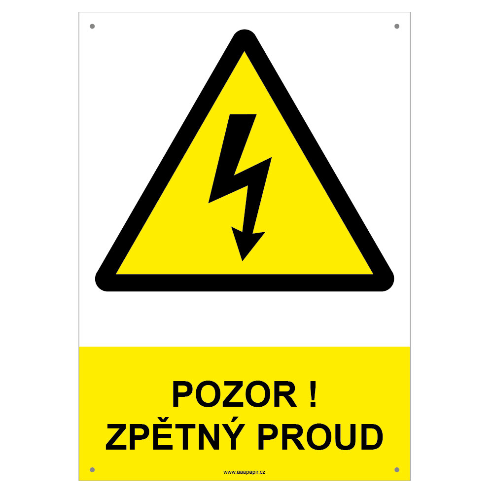 POZOR ! ZPĚTNÝ PROUD - bezpečnostní tabulka s dírkami, plast A4, 2 mm