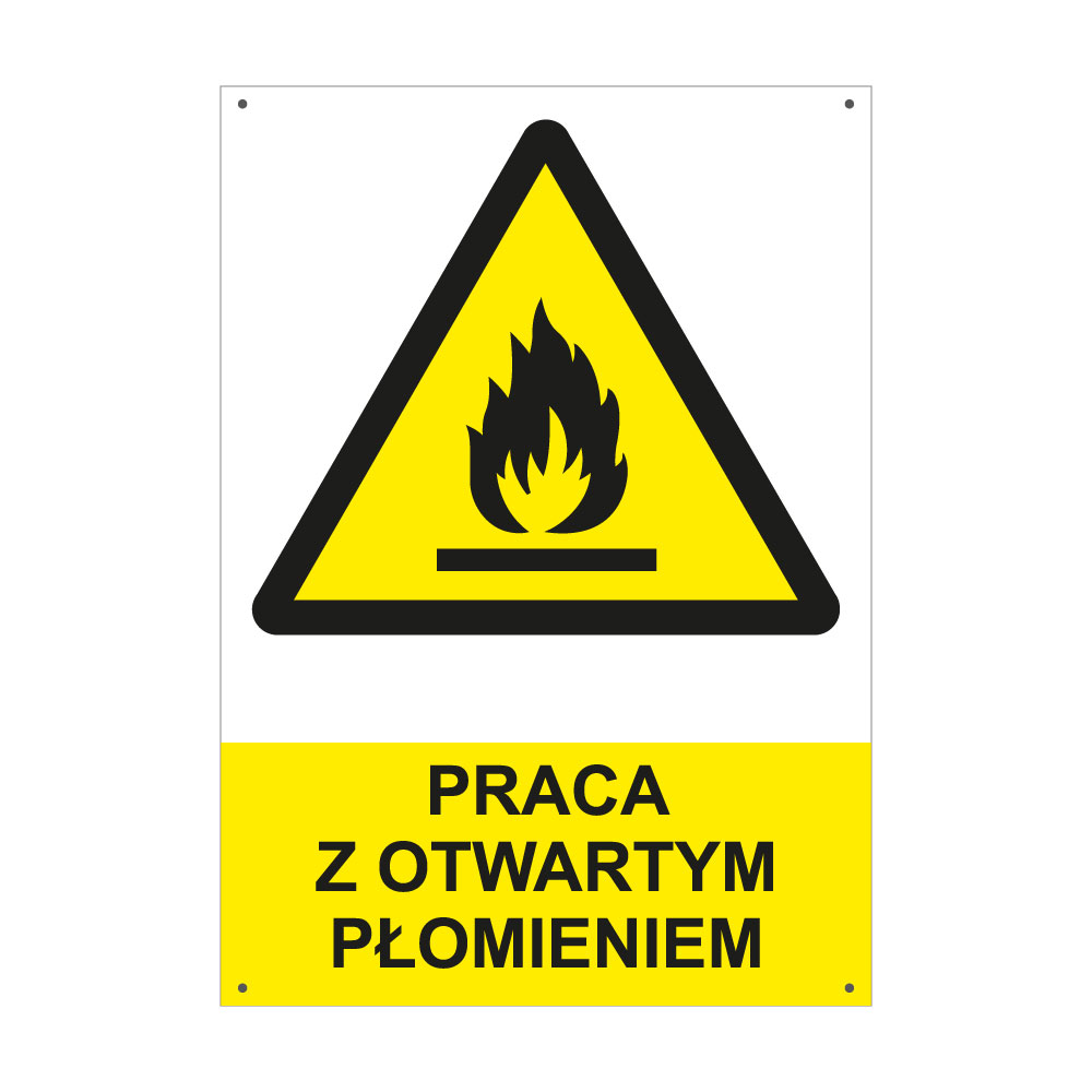 PRACA Z OTWARTYM PŁOMIENIEM - znak BHP z dziurkami, płyta PVC A4, 2 mm