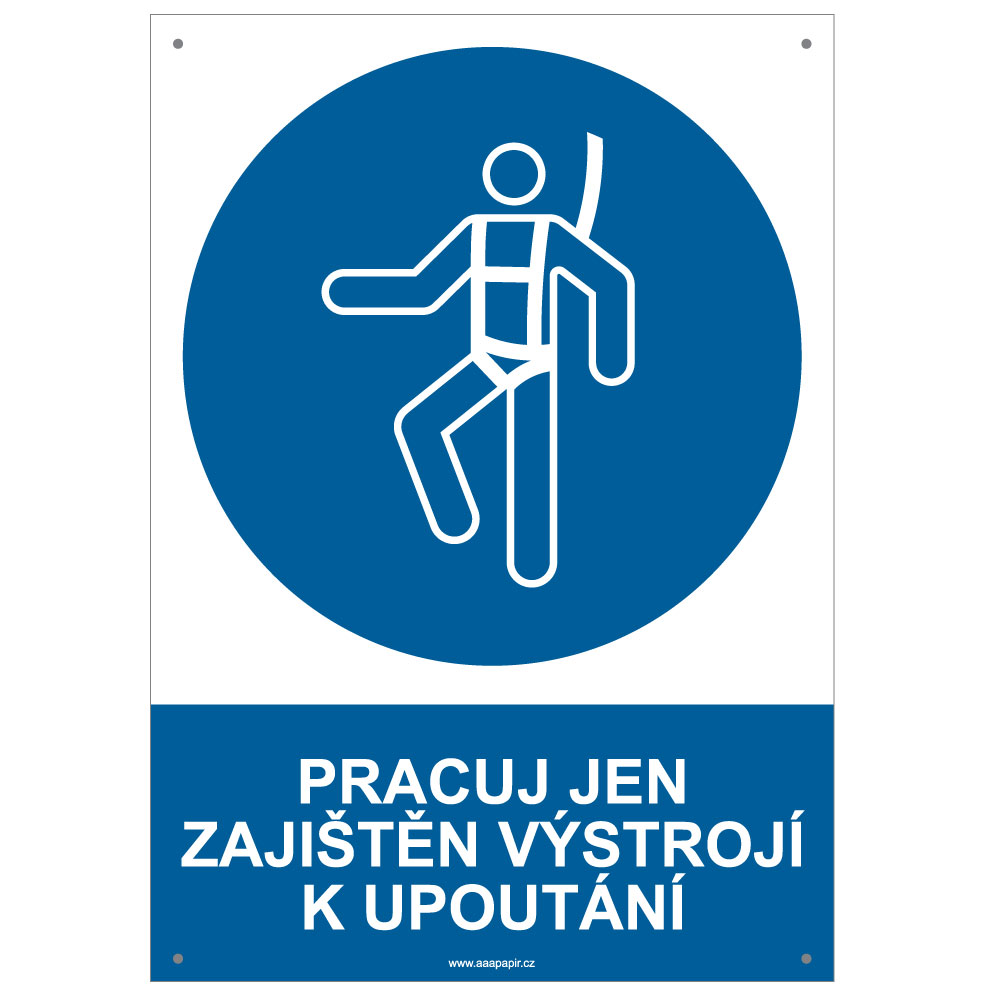 PRACUJ JEN ZAJIŠTĚN VÝSTROJÍ K UPOUTÁNÍ - bezpečnostní tabulka s dírkami, plast A4, 2 mm