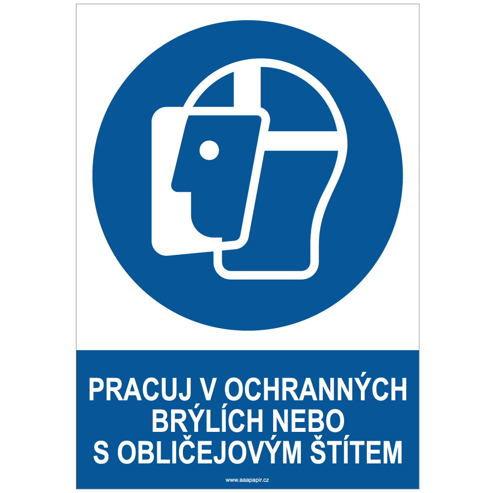 PRACUJ V OCHRANNÝCH BRÝLÍCH NEBO S OBLIČEJOVÝM ŠTÍTEM - bezpečnostní tabulka, samolepka A4