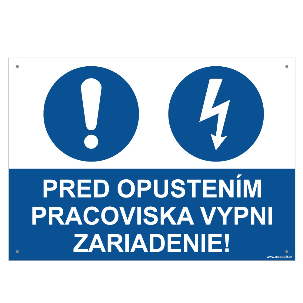 Pred opustením pracoviska vypni zariadenie - bezpečnostná tabuľka s dierkami, plast 2 mm - A4