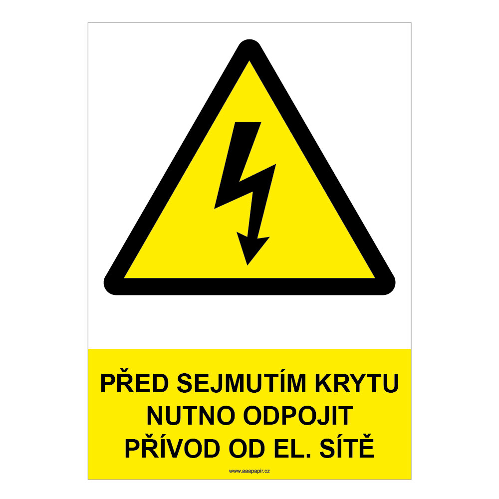 PŘED SEJMUTÍM KRYTU NUTNO ODPOJIT PŘÍVOD OD EL. SÍTĚ - bezpečnostní tabulka, samolepka A4