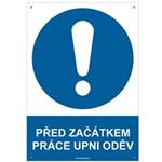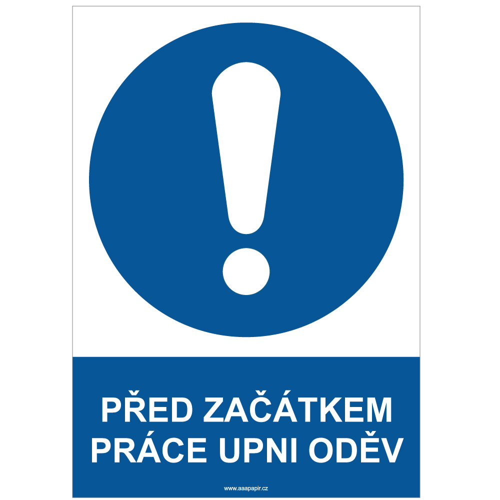 PŘED ZAČÁTKEM PRÁCE UPNI ODĚV - bezpečnostní tabulka, samolepka A4