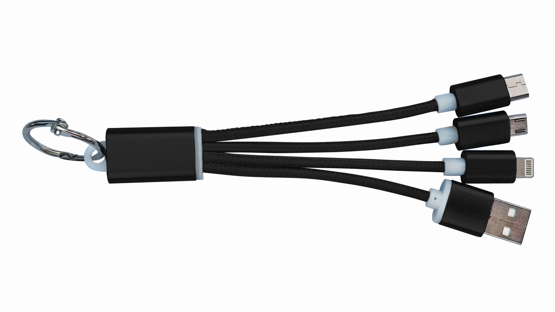 Prívesok s redukciami USB / Micro USB / iPhone / USB - C, s káblami v nylonovom oplete a koncovkami v hliníkovom puzdre