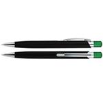 Plastové kuličkové pero s kovovými doplňky. Propiska plastová - Villain 9040 - černá/zelená Minimální počet k objednání je 100 ks. Propisky Vám na přání potiskneme. Potiskujeme barvami s certifikací OEKO-TEX® potvrzující neškodnost inkoustů při styku