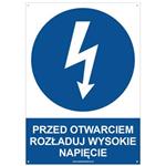 PRZED OTWARCIEM ROZŁADUJ WYSOKIE NAPIĘCIE - znak BHP, naklejka A4