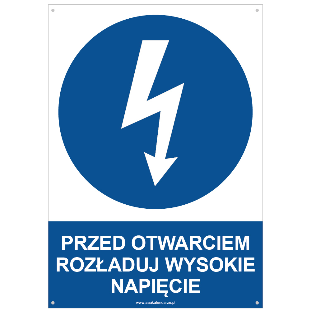 PRZED OTWARCIEM ROZŁADUJ WYSOKIE NAPIĘCIE - znak BHP z dziurkami, płyta PVC A4, 2 mm