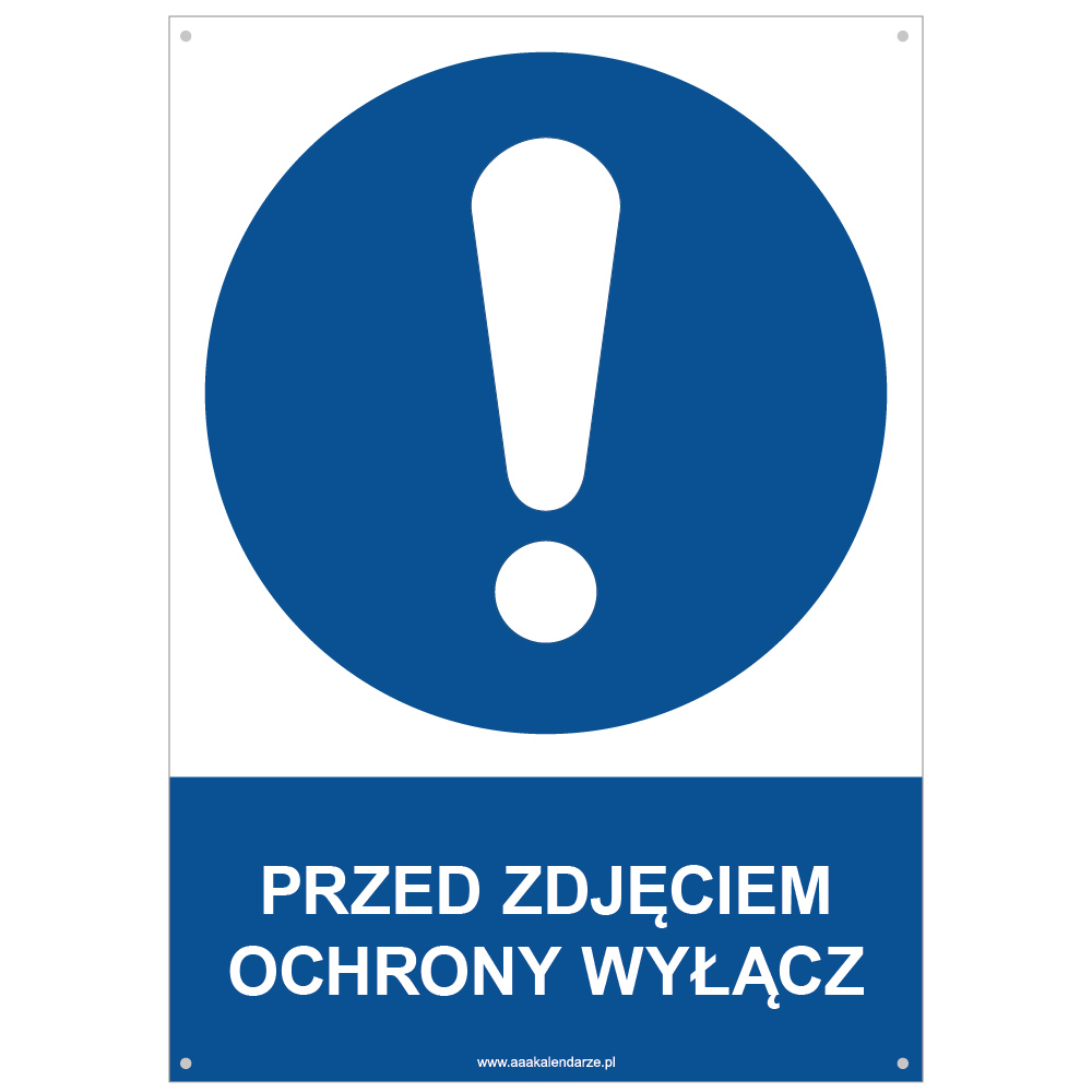 PRZED ZDJĘCIEM OCHRONY WYŁĄCZ - znak BHP z dziurkami, płyta PVC A4, 2 mm