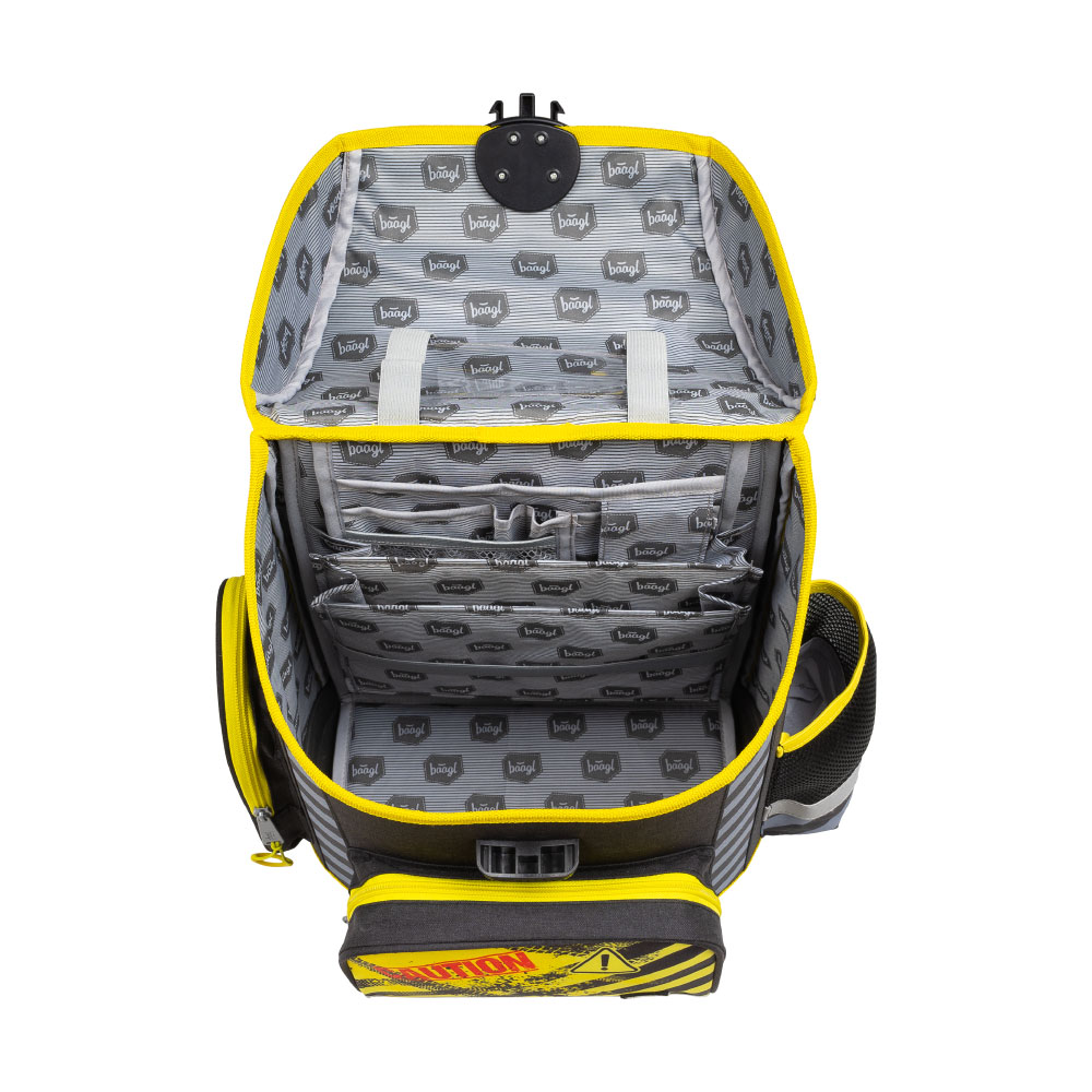 • Školská aktovka s vystuženým telom, vnútorným organizérom a troma oddelenými kapsami a zapínaním na kvalitnú pracku.