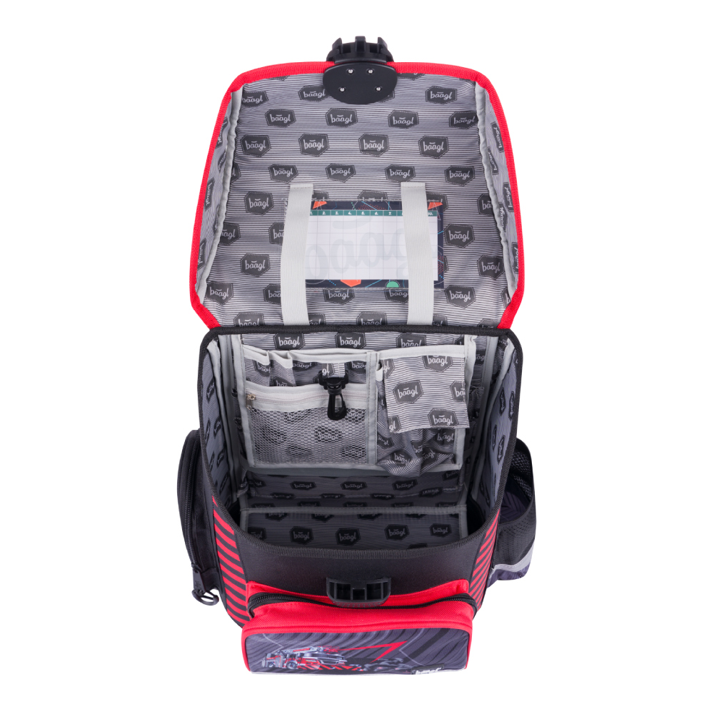 • Vovnútri aktovky je priehľadná kapsa s rozvrhom a vnútorný organizér umožňujúci rovnomerné rozloženie hmotnosti.