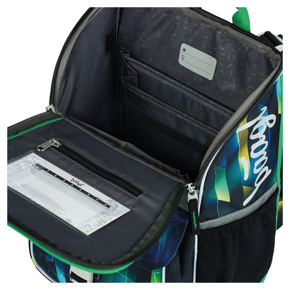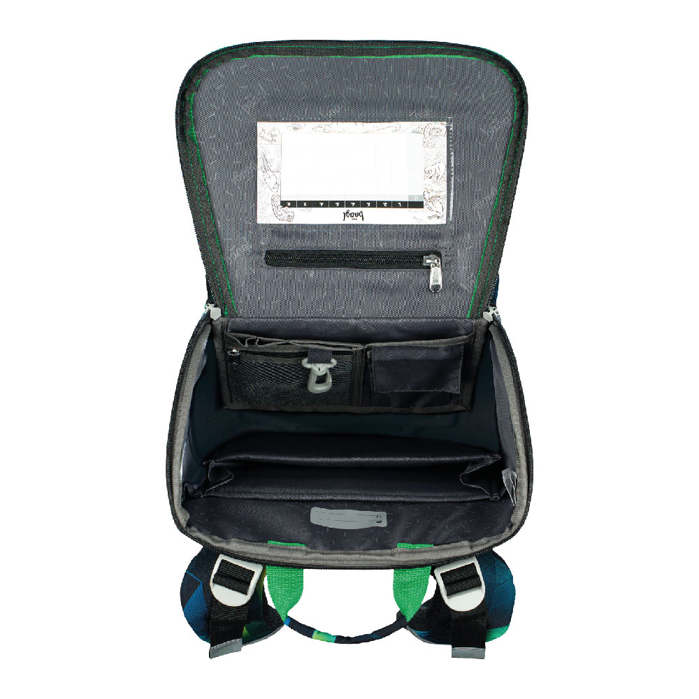 • Vnútri aktovky je priehľadná kapsa s rozvrhom a vnútorný organizér umožňujúci rovnomerné rozloženie hmotnosti doplnený gumičkou kvôli fixácii.