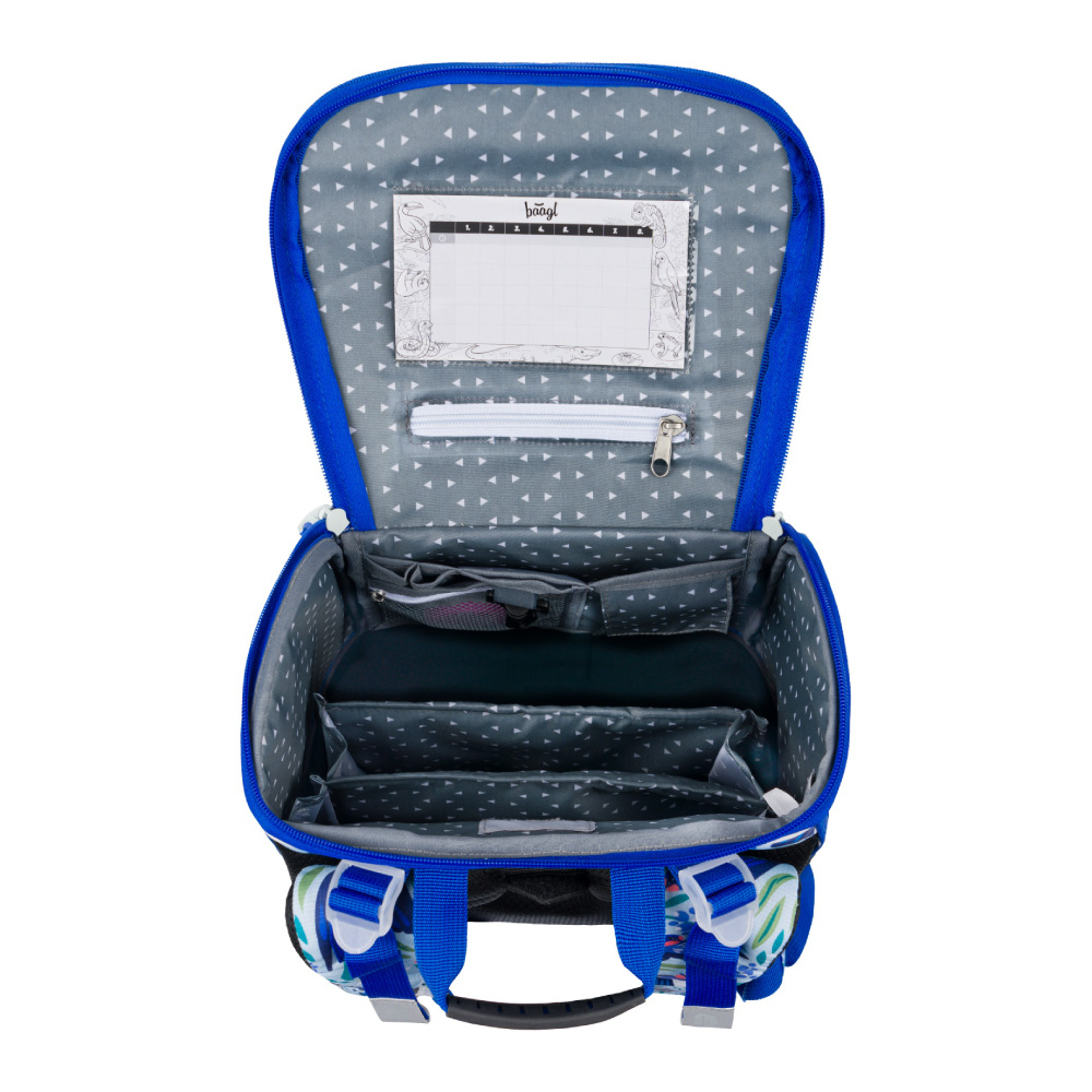 • Vnútri aktovky je priehľadná kapsa s rozvrhom a vnútorný organizér umožňujúci rovnomerné rozloženie hmotnosti doplnený gumičkou kvôli fixácii.