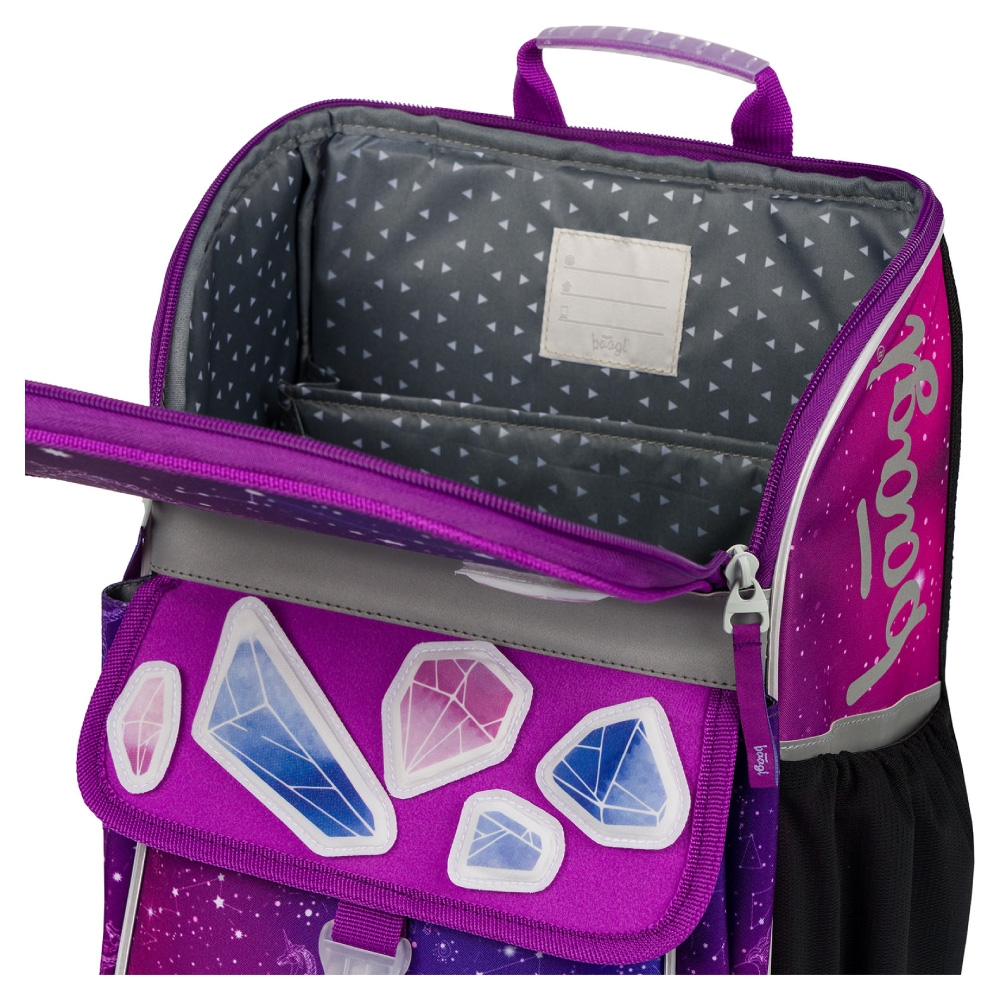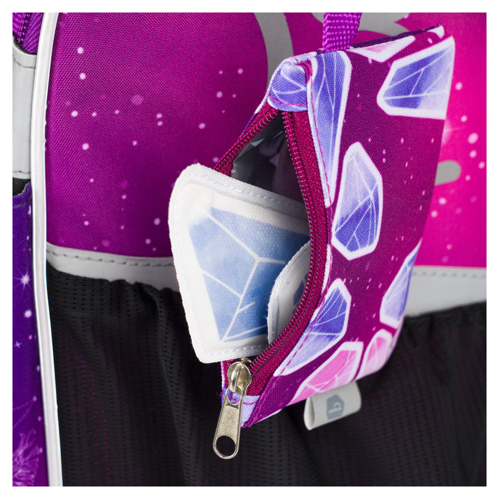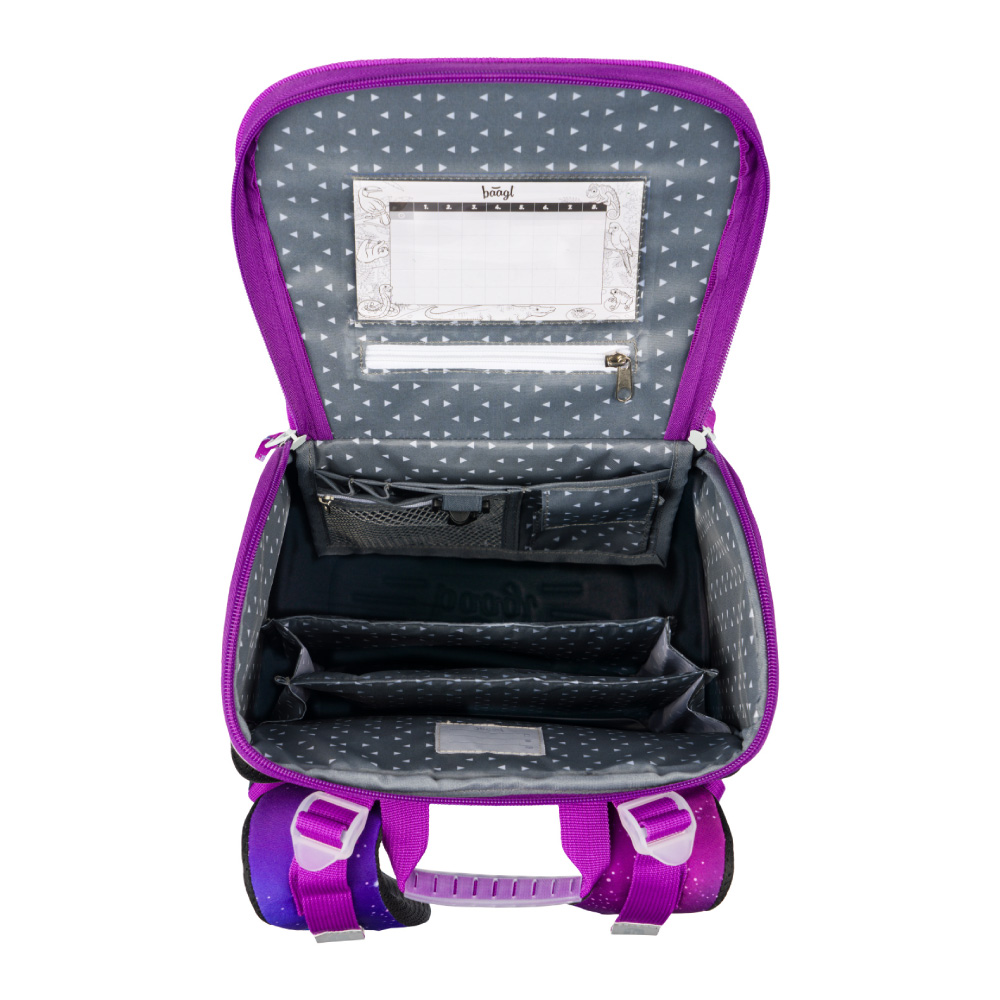 • Vnútri aktovky je priehľadná kapsa s rozvrhom a vnútorný organizér umožňujúci rovnomerné rozloženie hmotnosti doplnený gumičkou kvôli fixácii.