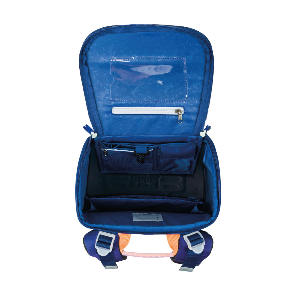 • Vnútri aktovky je priehľadná kapsa s rozvrhom a vnútorný organizér umožňujúci rovnomerné rozloženie hmotnosti doplnený gumičkou kvôli fixácii.