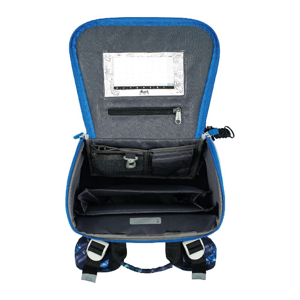 • Vnútri aktovky je priehľadná kapsa s rozvrhom a vnútorný organizér umožňujúci rovnomerné rozloženie hmotnosti doplnený gumičkou kvôli fixácii.