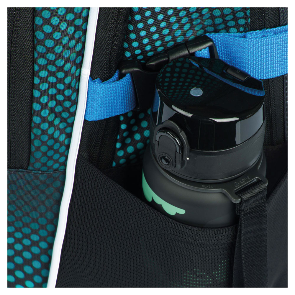 • Bočné vrecká z pevnej sieťoviny, ktoré sú vhodné pre jednu z našich fliaš na pitie.
