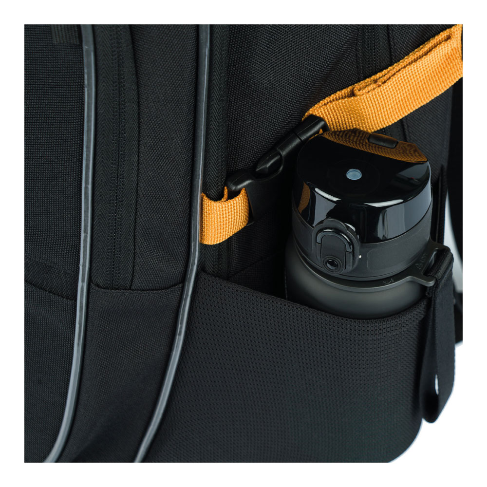 • Bočné vrecká z pevnej sieťoviny, ktoré sú vhodné pre jednu z našich fliaš na pitie.