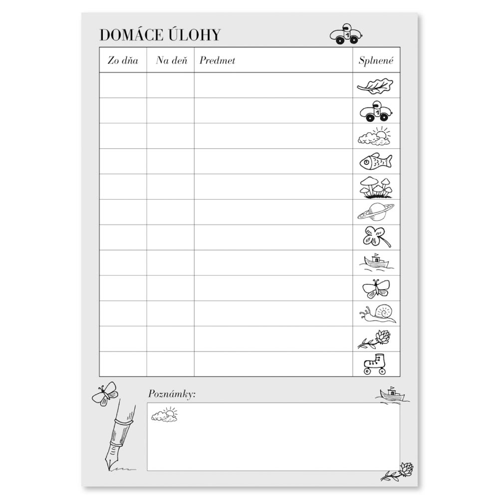 Obsahuje: rozvrh hodín, s možnosťou zapisovania úloh a poznámok