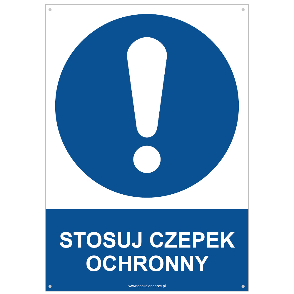 STOSUJ CZEPEK OCHRONNY - znak BHP z dziurkami, płyta PVC A4, 2 mm