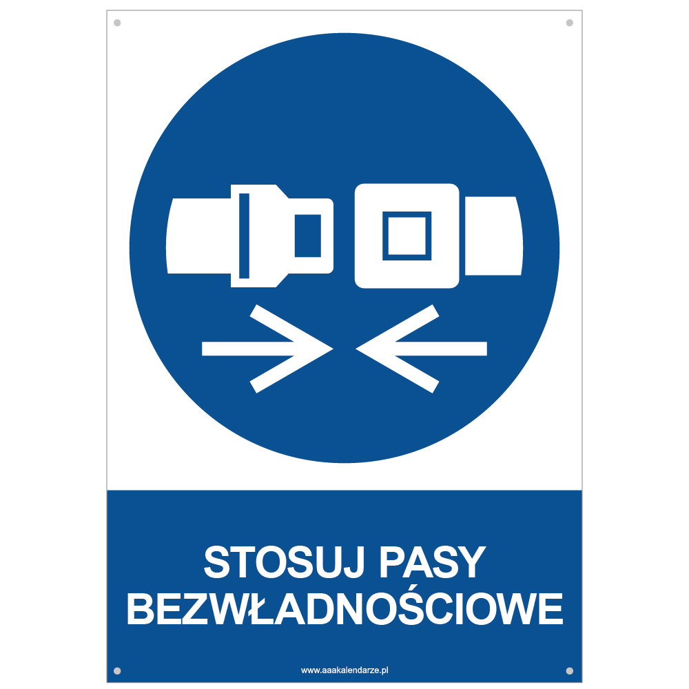 STOSUJ PASY BEZWŁADNOŚCIOWE - znak BHP z dziurkami, płyta PVC A4, 2 mm